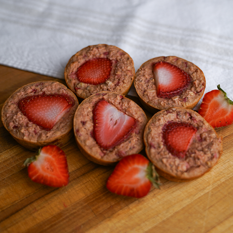- Pour batter evenly into muffin tin, and top each muffin with a strawberry slice.