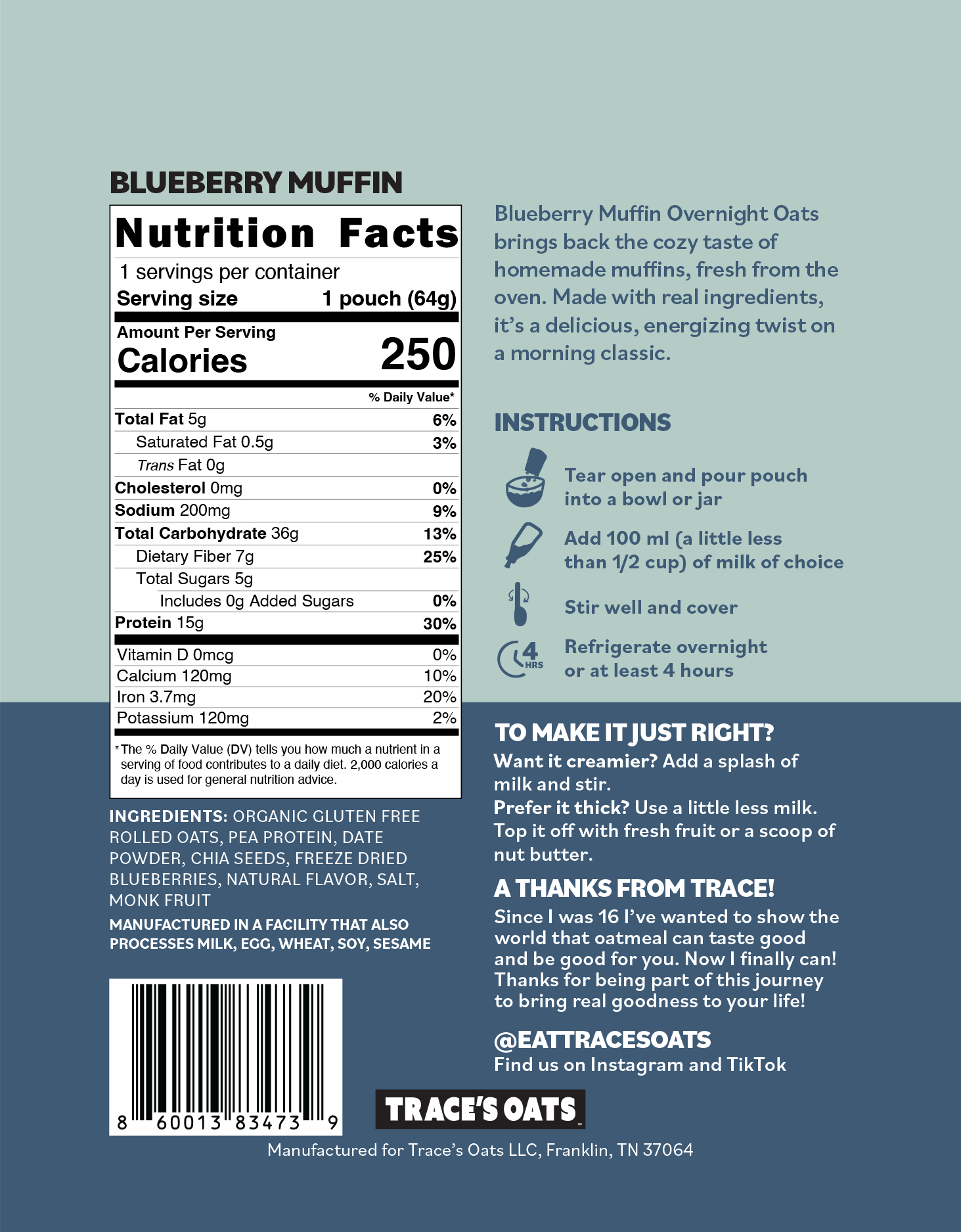 Packed with 15g of protein, 7g of fiber, and no added sugar, these oats are gluten-free and made with clean ingredients you can trust. Just add milk, let it soak overnight, and wake up to a ready-to-eat, high-protein breakfast that saves time without sacrificing flavor.